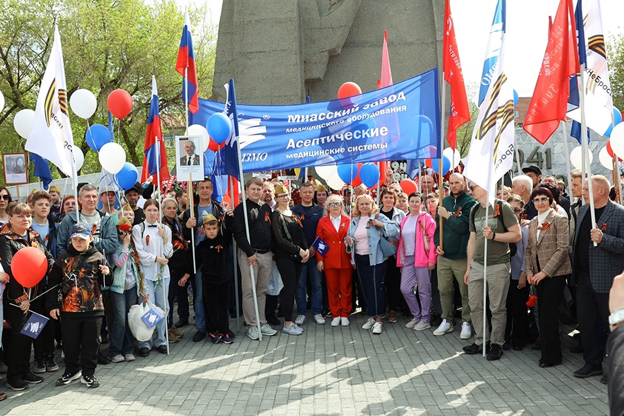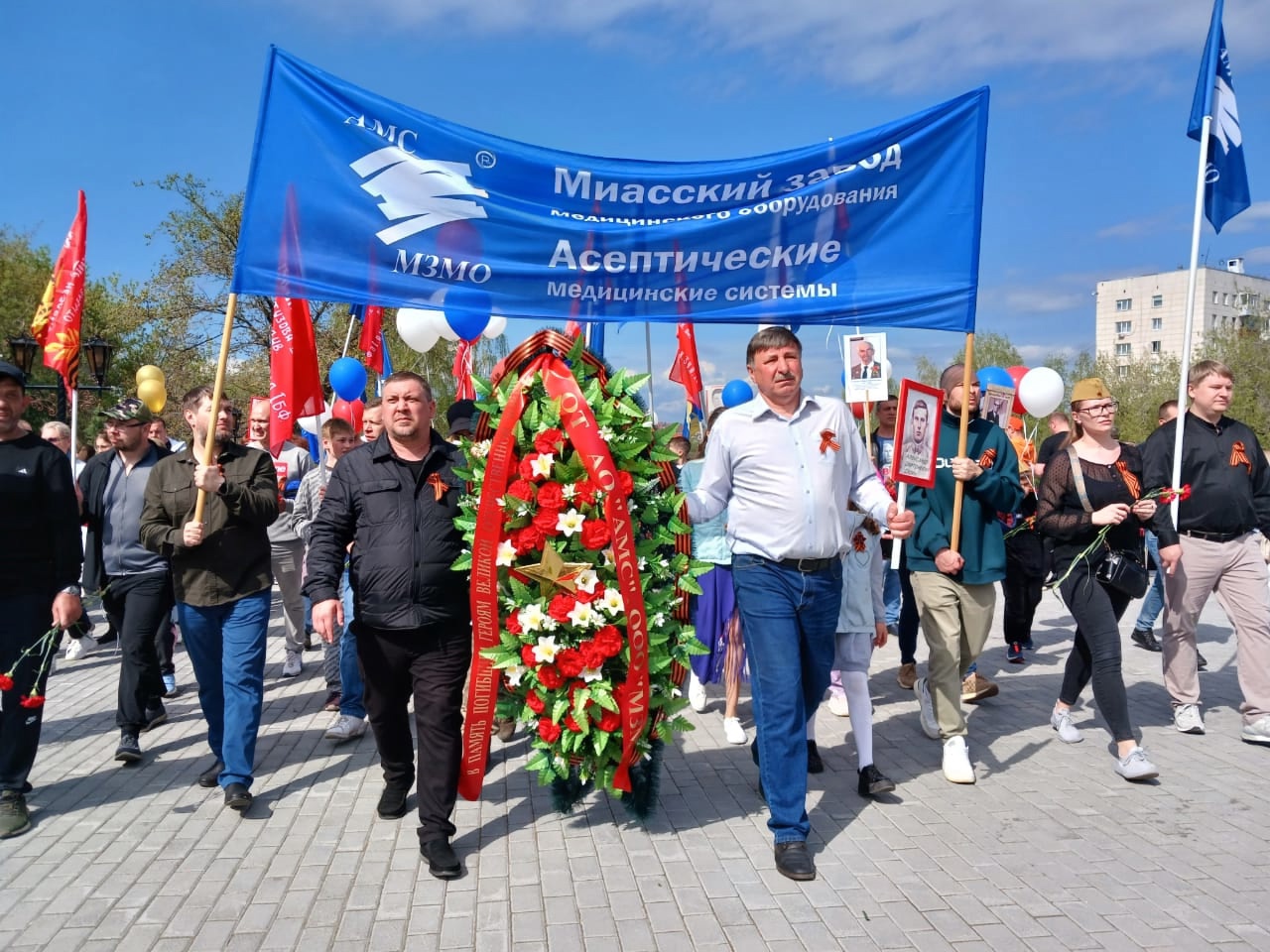 Сотрудники всех подразделений предприятия вместе со своими семьями приняли участие в торжественном шествии и возложении цветов к мемориалу «Скорбящая Мать» в центре Миасса. Колонну коллектива возглавил генеральный директор Миасского завода медицинского оборудования Виктор Гринь.