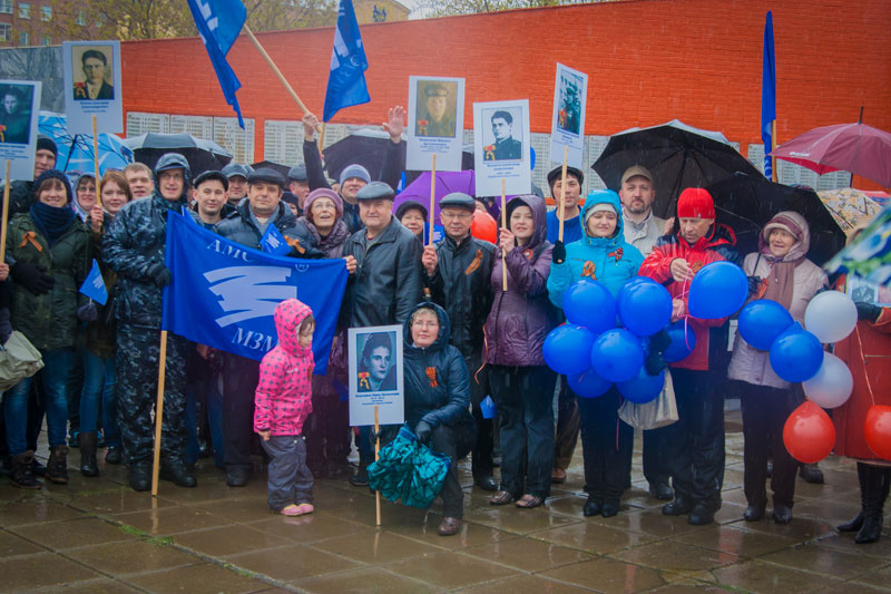Несмотря на пасмурную погоду и холодный проливной дождь дружный коллектив объединения «АМС-МЗМО» прошел многочисленной колонной по главному городскому проспекту Автозаводцев до Мемориала скорбящей матери. Настроение участников парада было боевым и радостным. Люди скандировали: «Ура! С Днем Победы!» и пели песни военных лет. В руках у участников шествия были портреты ветеранов. Так дети, внуки и правнуки героев войны почтили их память, присоединившись к Всероссийской акции «Бессмертный полк».