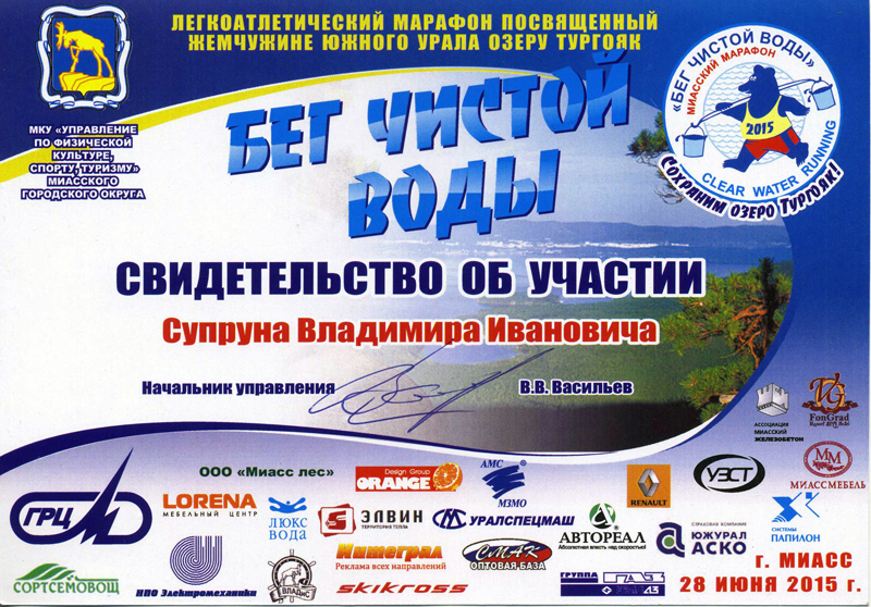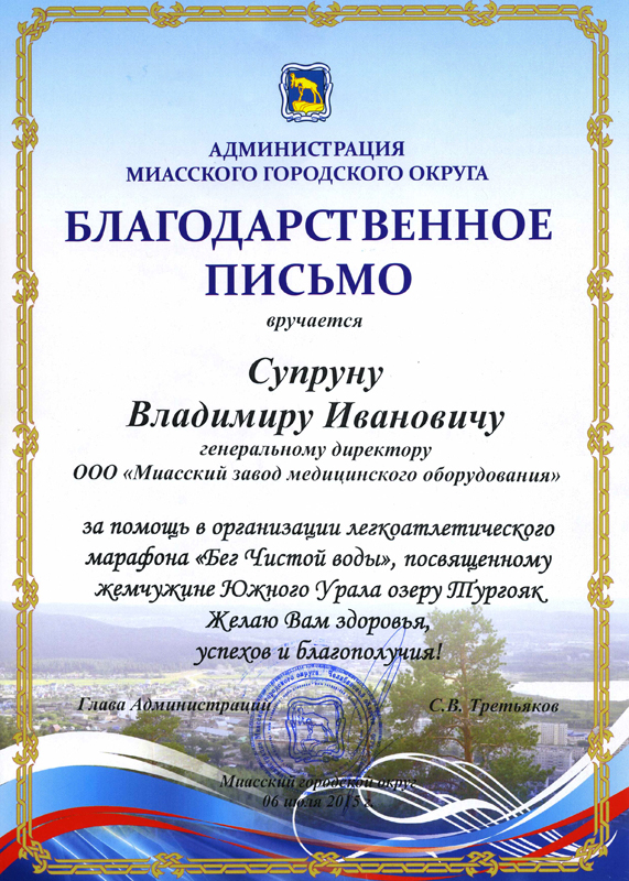 В адрес президента объединения Владимира Ивановича Супруна направлено письмо от имени главы администрации Миасса Станислава Третьякова. В письме выражается благодарность за помощь в проведении всероссийского легкоатлетического марафона «Бег чистой воды».