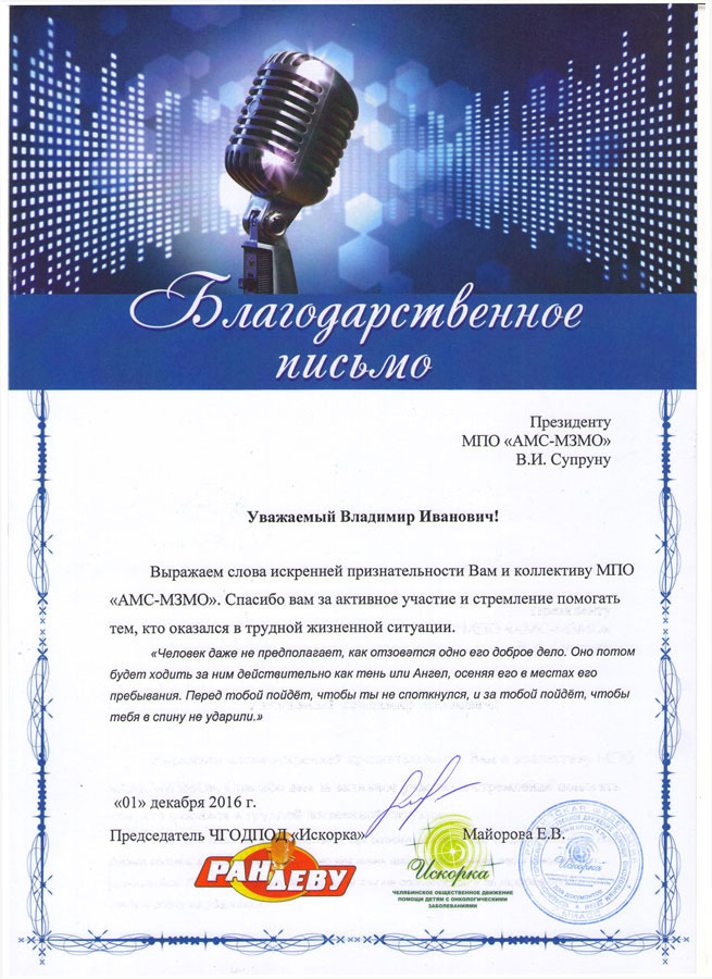 В адрес президента НПО «АМС-МЗМО» Владимира Супруна и коллектива объединения направлено благодарственное письмо от председателя общественного движения «Искорка» Евгении Майоровой. В письме выражены слова признательности за стремление помогать тем, кто оказался в трудной жизненной ситуации.
