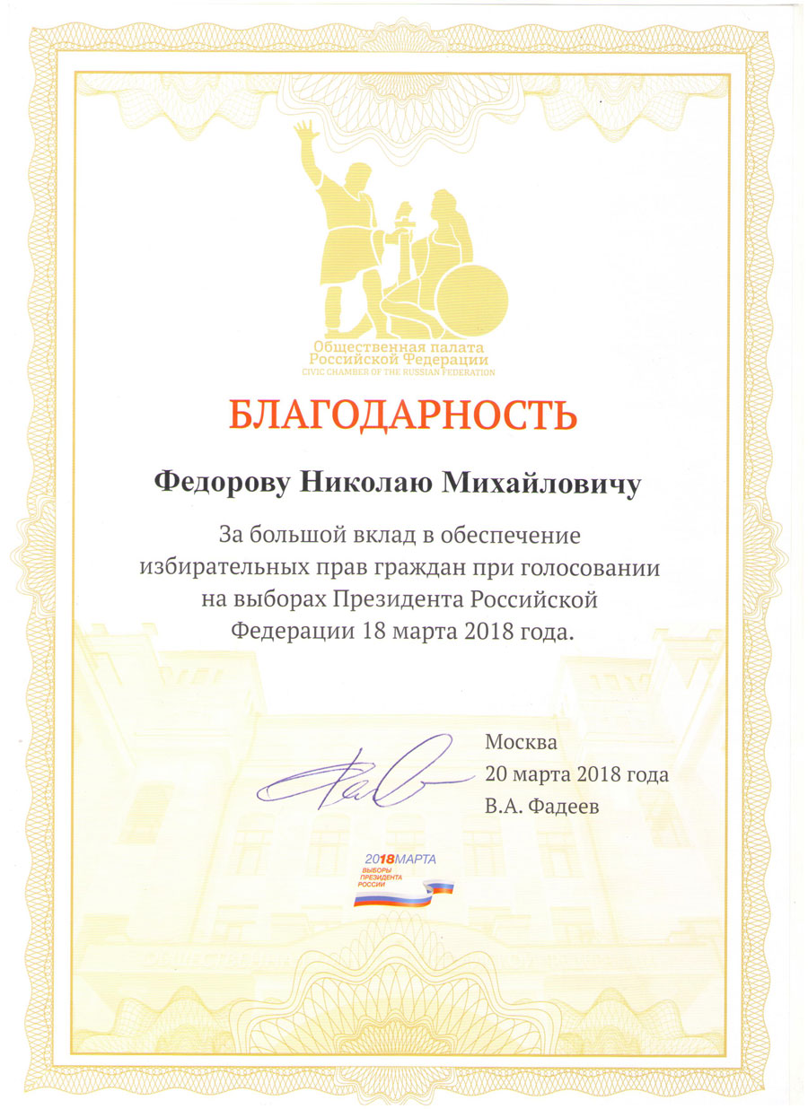 В заключении заседания председатель Общественной палаты города Сергей Соловьев вручил благодарности Общественной палаты Российской Федерации, подписанные секретарём ОП Валерием Фадеевым, за большой вклад в обеспечение избирательных прав граждан при голосовании на выборах Президента Российской Федерации 18 марта 2018 года. В числе награжденных – заместитель генерального директора НПО «АМС-МЗМО», член Общественной палаты Миасса Николай Михайлович Федоров. Поздравляем!