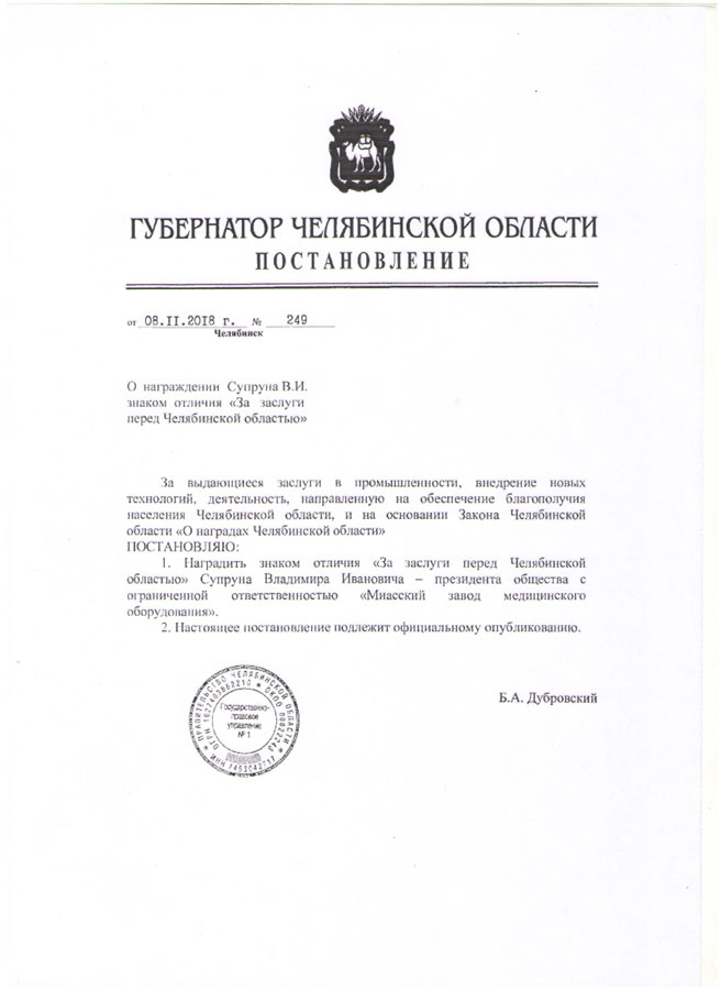 Владимир Иванович удостоен высшей награды региона за выдающиеся заслуги в промышленности, внедрение новых технологий, деятельность, направленную на обеспечение благополучия населения Челябинской области.