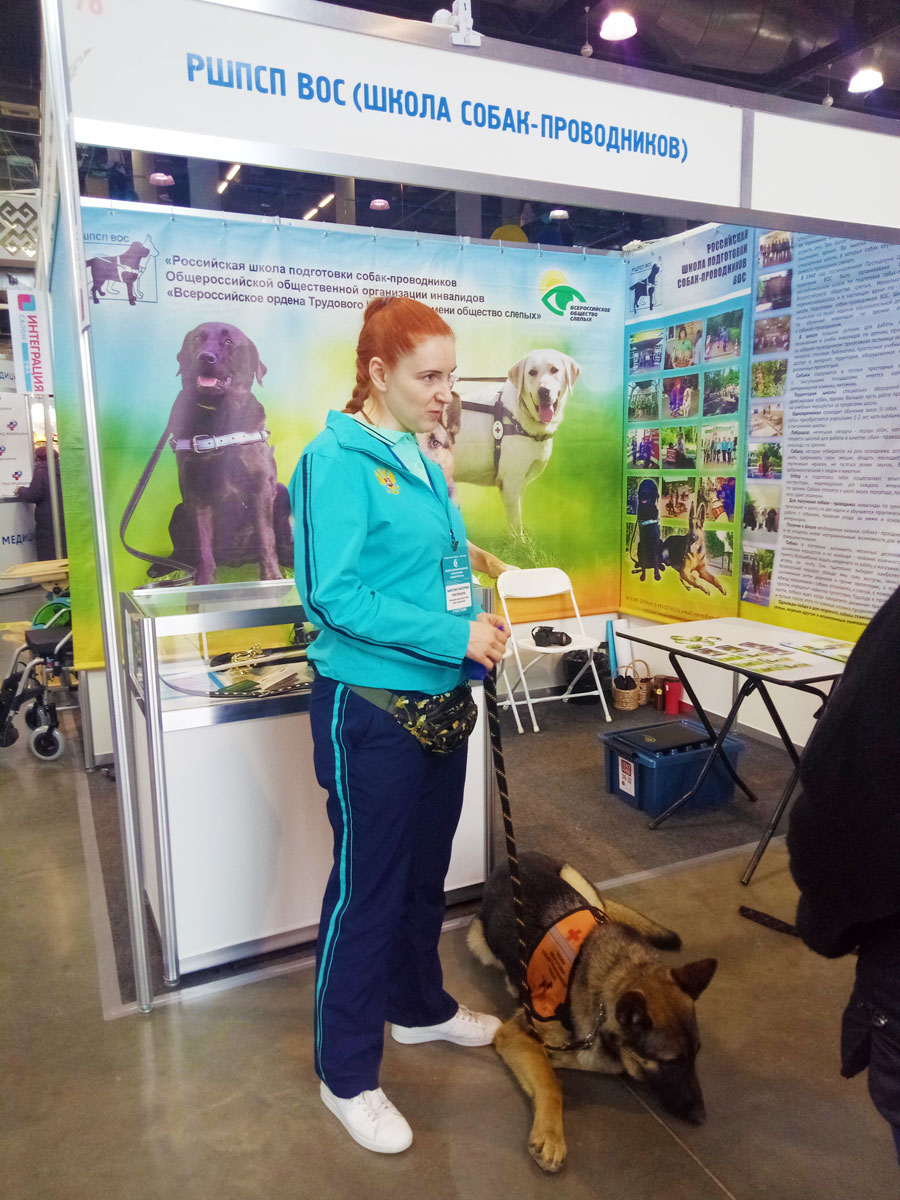 На «центральной площади» выставочного городка организациями проводились презентации своих продуктов или услуг. Самым зрелищным, я считаю, было выступление школы подготовки собак-поводырей. Зрителям были продемонстрированы работа инструктора и собаки при отработке навыков помощи людям с ограниченными возможностями по зрению. Инструкторы даже устроили своеобразный интерактив: любой желающий мог с закрытыми глазами пройти полосу препятствий с помощью специальных подсказок хвостатых помощников.