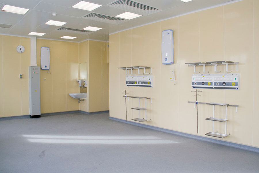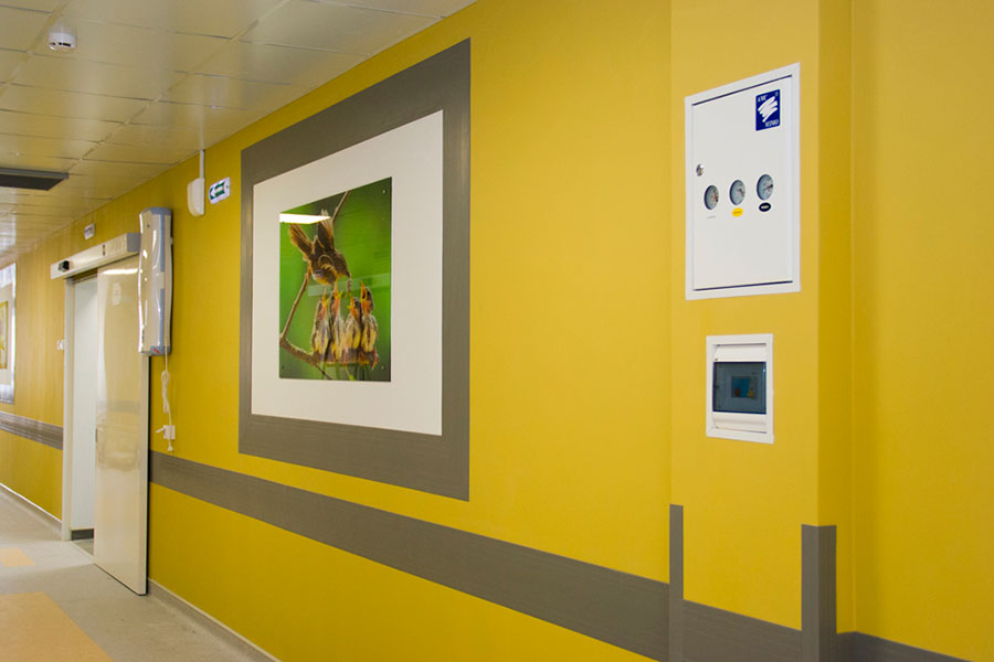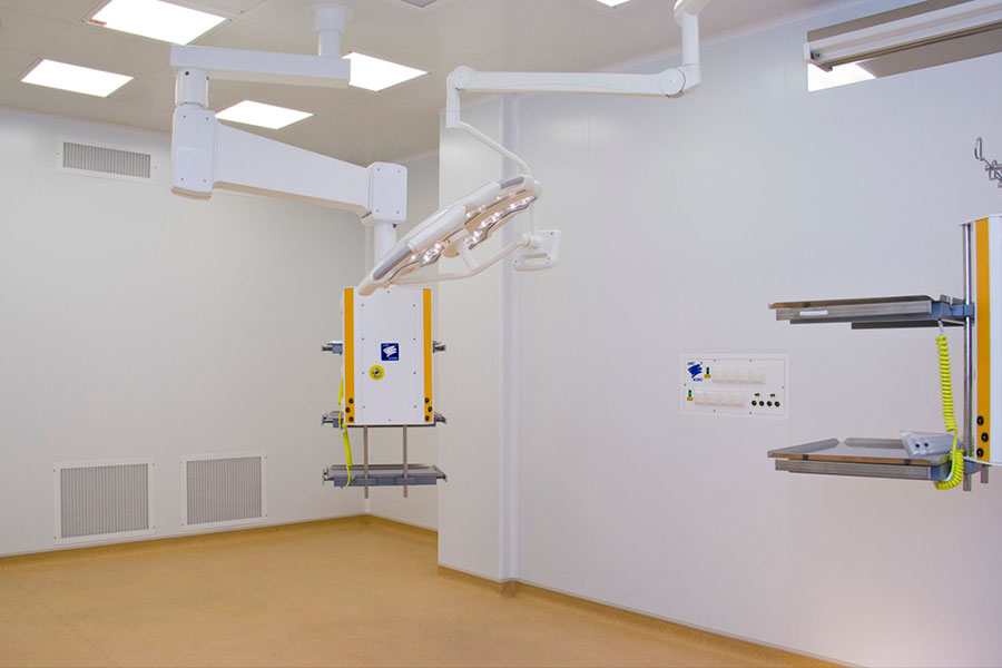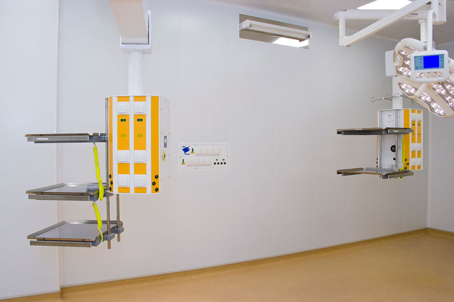 По разделу проекта «Медицинское газоснабжение» были смонтированы потолочные хирургические, анестезиологические, настенные реанимационные консоли жизнеобеспечения. Выполнена установка медицинской компрессорной и вакуумной станций подачи сжатого воздуха и вакуума, необходимых для работы операционного блока.