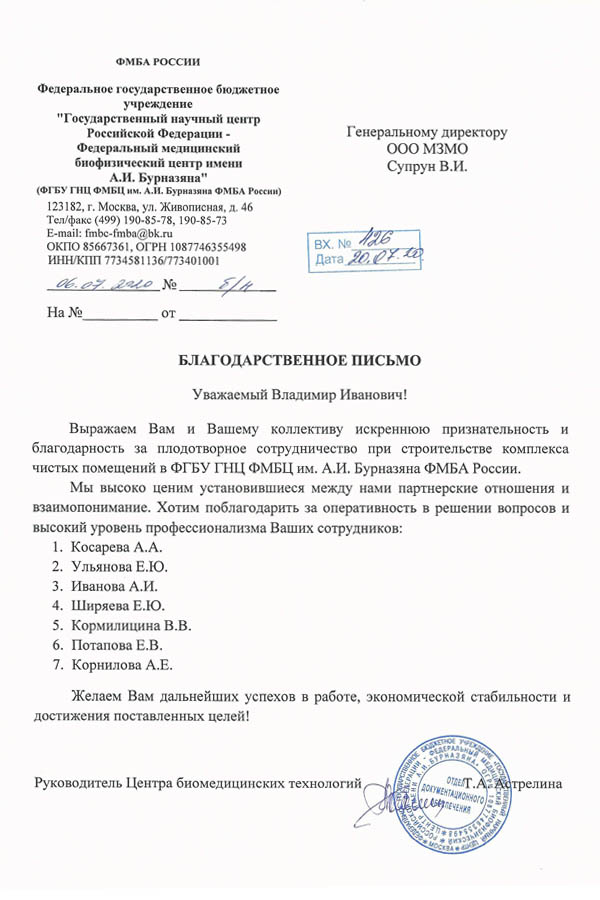 Благодарственное письмо от руководителя Центра биомедицинских технологий Татьяны Астрелиной направлено в адрес президента объединения «АМС-МЗМО» Владимира Супруна. В нем выражается признательность за плодотворное сотрудничество при строительстве чистых помещений: