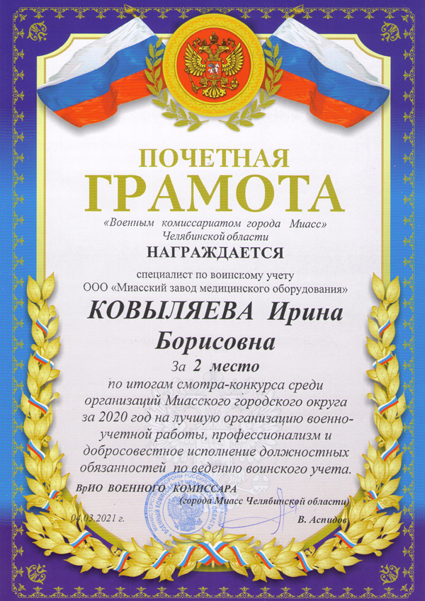 В рамках выполнения плана организации работ по воинскому учету и бронированию граждан, утвержденному главой города Миасса в 2020 году, военным комиссариатом города был проведен смотр-конкурс среди кадровых служб промышленных предприятий. Миасский завод медицинского оборудования признан лучшим и занял почетное второе место.