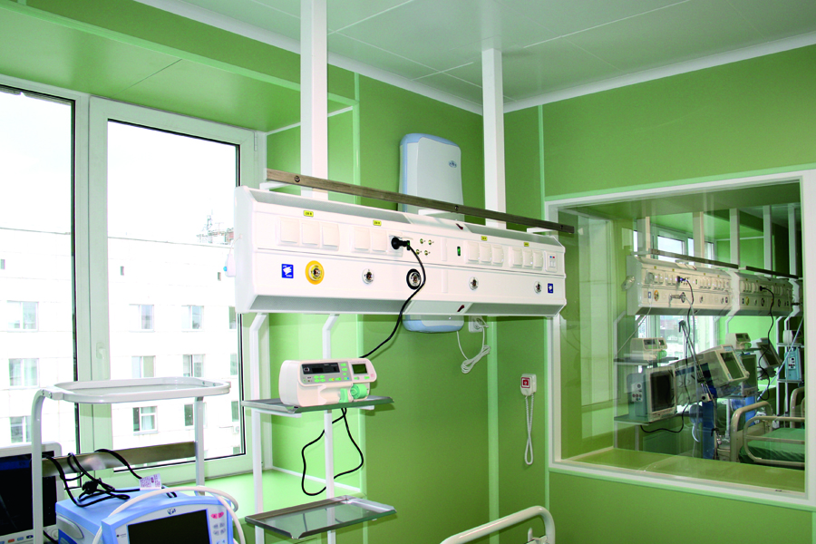 Общая площадь отделения составляет 177 кв. метров. Состав чистых помещений: приточно-вытяжная система, системы распределения и финишной очистки воздуха, ограждающие конструкции− стены, потолок, пол, двери, смотровые окна. В палатах интенсивной терапии также установлены системы медицинского газоснабжения − консоли подвода медицинских газов и электропитания «АМС-МЗМО»