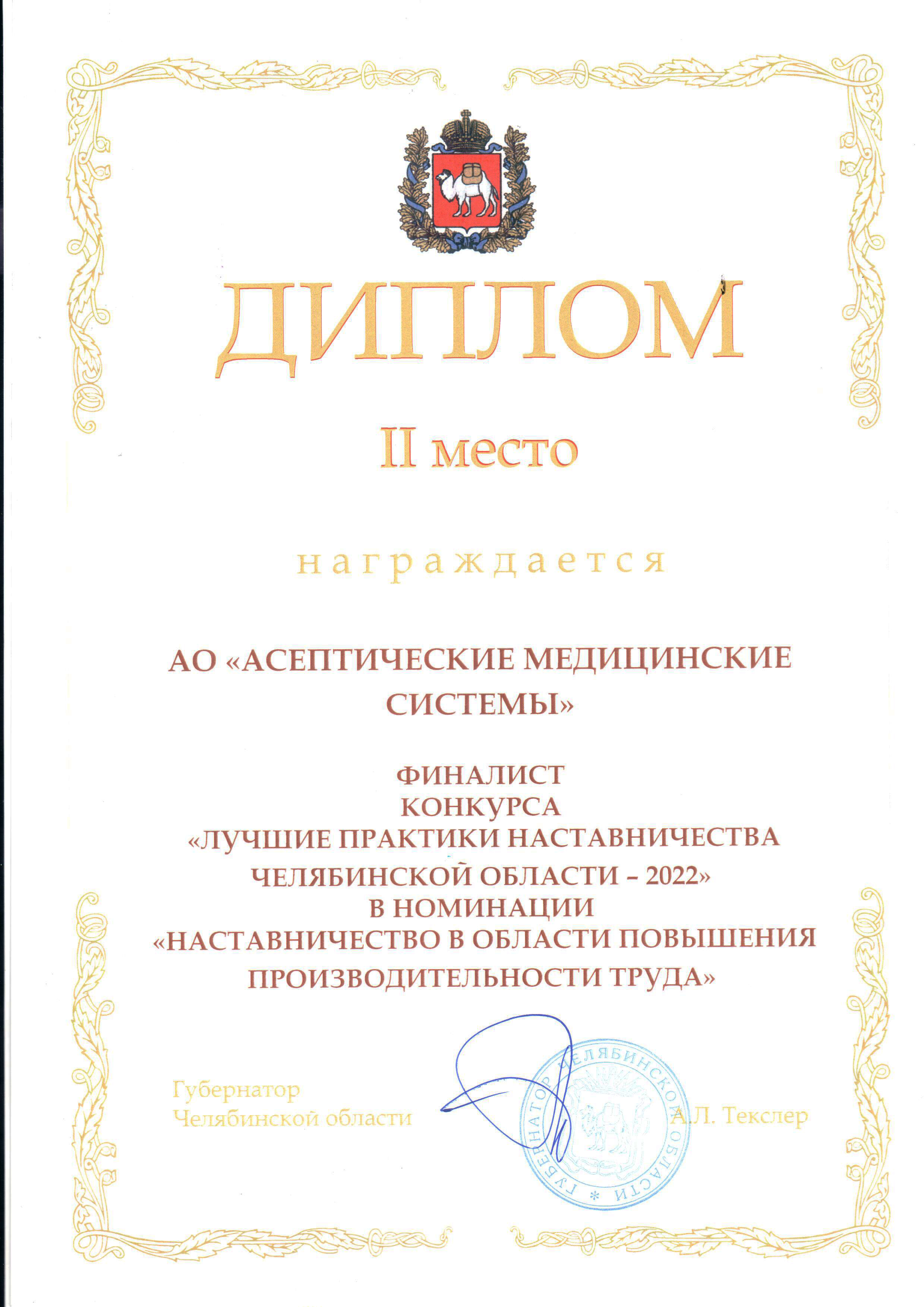 Диплом за 2 место от имени Губернатора Челябинской области Алексея Текслера накануне представителям предприятия вручил вице-губернатор Егор Ковальчук.
