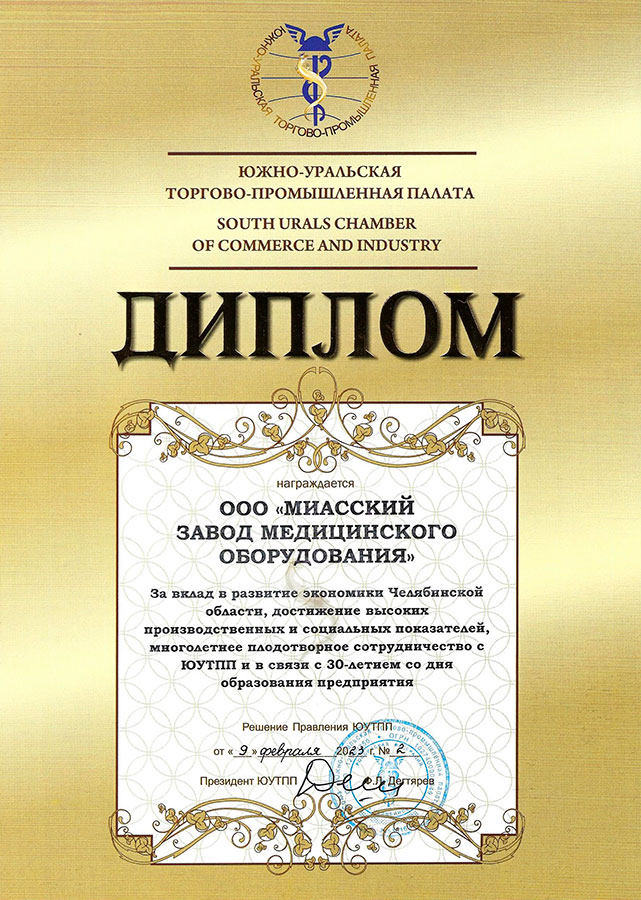 Решением Правления ЮУТПП Миасский завод медицинского оборудования награжден Дипломом за вклад в развитие экономики Челябинской области, достижение высоких производственных и социальных показателей, многолетнее плодотворное сотрудничество с ЮУТПП и в связи с 30-летием со дня образования предприятия.