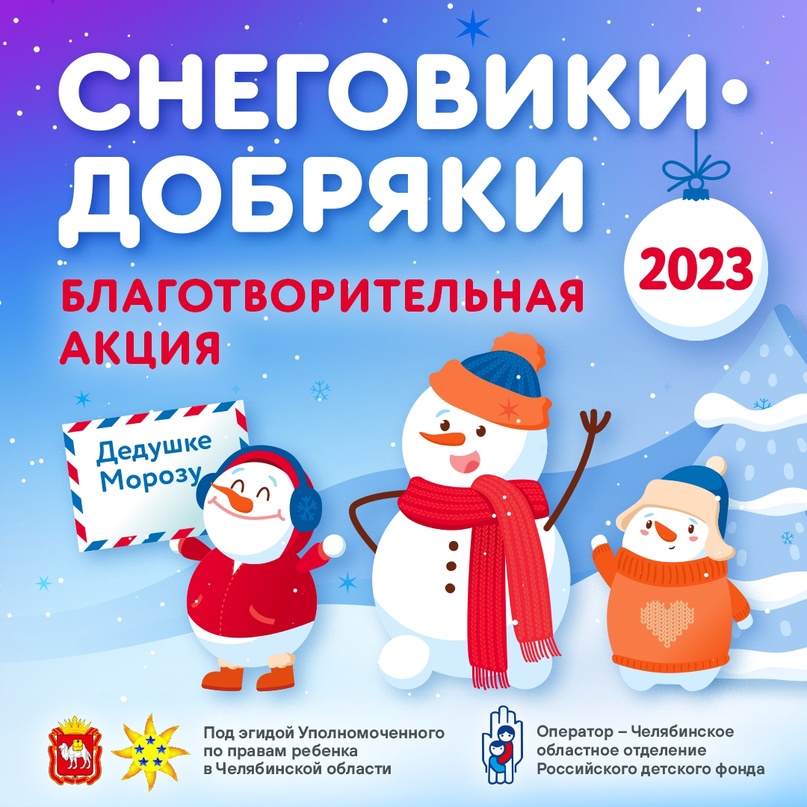 Акция «Снеговики-добряки» проводится в регионе с 2019 года при поддержке Губернатора Челябинской области Алексея Текслера. По условиям акции коллективы компаний, организаций, любые объединения людей, семьи и просто добрые люди исполняют новогодние мечты детей с тяжелыми заболеваниями и детей, находящихся в трудной жизненной ситуации, достигшие успеха в различных сферах под руководством наставника.