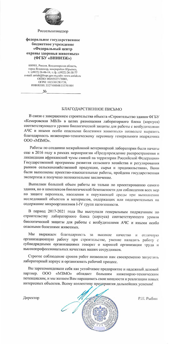 Миасский завод медицинского отмечен благодарственным письмом от руководства ФГБУ «ВНИИЗЖ» в связи с завершением строительства Кемеровской МВЛ. В письме подчеркивается высокое качество работ и отличная организация труда при строительстве.