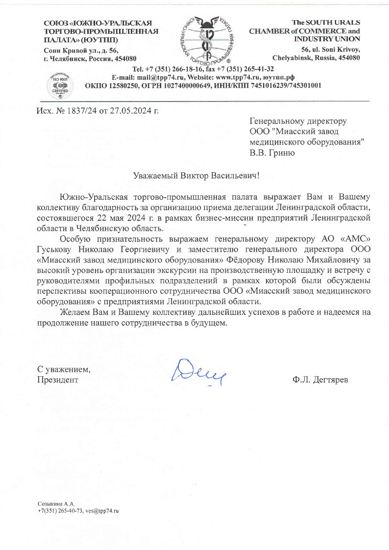 Президент Южно-Уральской торгово-промышленной палаты Фёдор Дегтярёв направил письмо в адрес генерального директора ООО «МЗМО» Виктора Гринь. В письме выражается благодарность за организацию приёма делегации Ленинградской области: