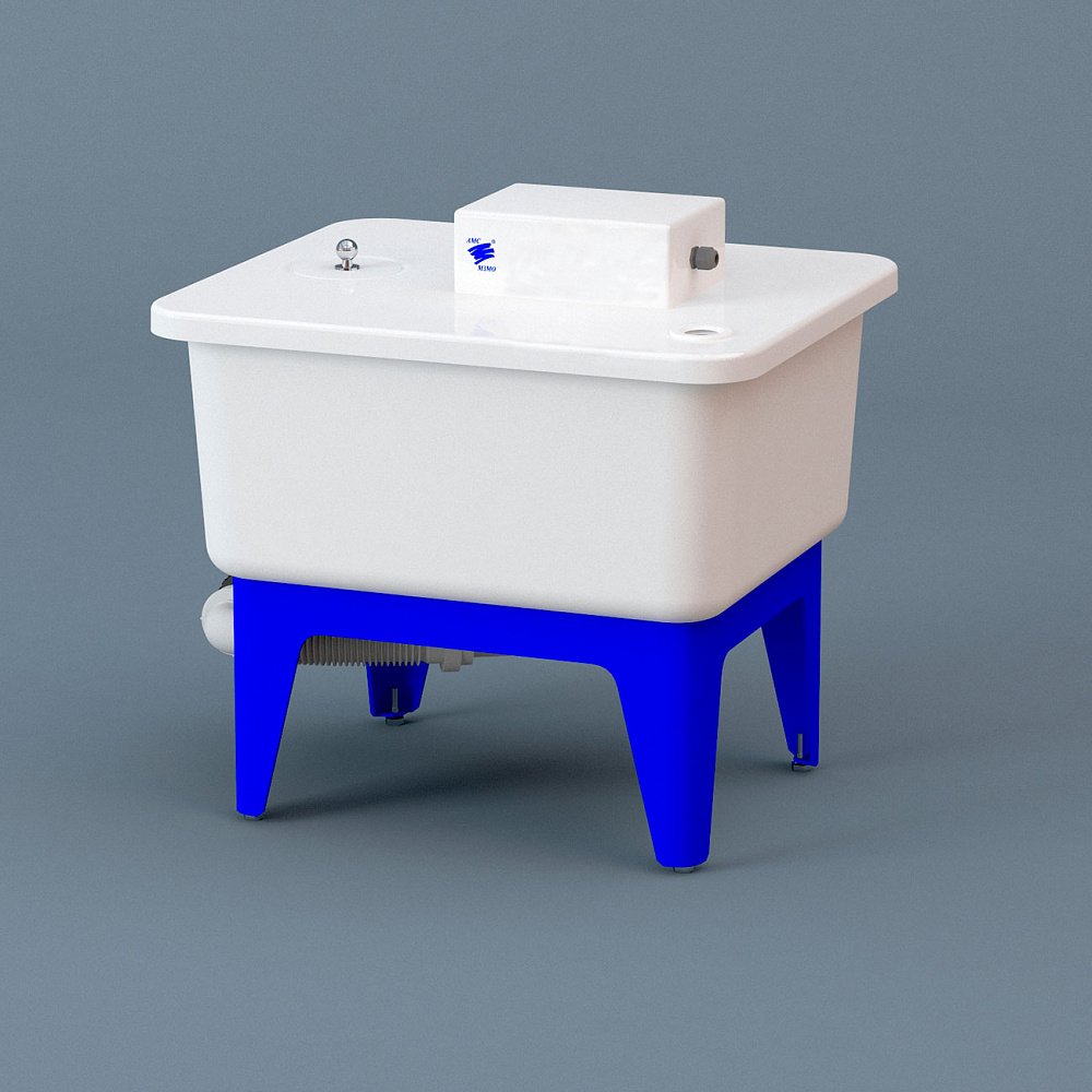Конструктивно установка представляет собой прямоугольную ёмкость – бак из пластика на металлической окрашенной подставке с регулируемыми опорами со съемной пластиковой крышкой и пультом управления в комплекте. На крышке ёмкости смонтирован мотор-редуктор, поплавковый датчик уровня жидкости, имеется отверстие для присоединения слива от мойки и отверстие с крышкой под засыпку (заливку) дезинфицирующих средств. Мотор-редуктор имеет шток с четырьмя лопастями для перемешивания жидкости в ёмкости. Управление работой электроэлементов установки производится с пульта управления безопасным напряжением 12 В.
