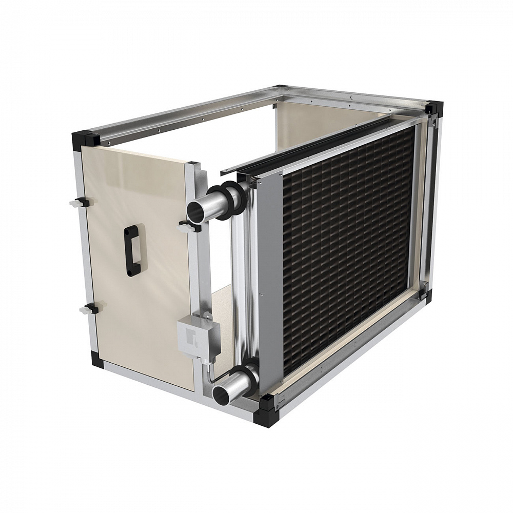 Блок нагревателя 1 ступени состоит из корпуса, водяного (гликолевого) теплообменника, воздушного термостата защиты от «разморозки», В корпусе кондиционера теплообменник устанавливается вертикально на специальных направляющих, позволяющих выдвигать его для осмотра, очистки и ремонта. Процедура демонтажа упрощается при заказе нагревателя со стороной подключения, противоположной стороне обслуживания. Защитный термостат монтируется на выдвижной раме с отдельной съемной панелью.